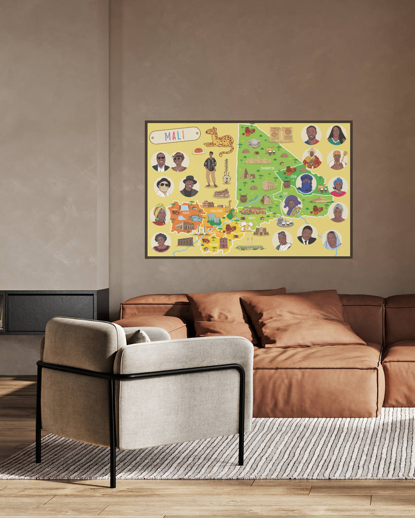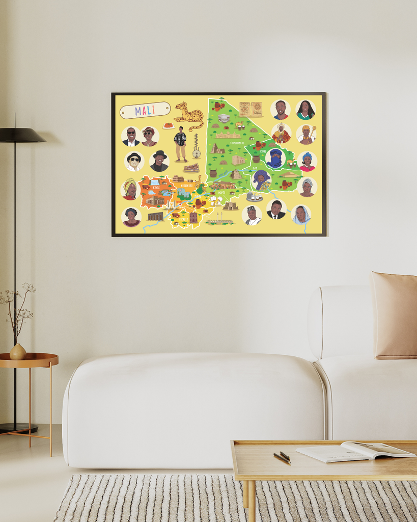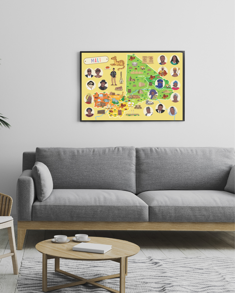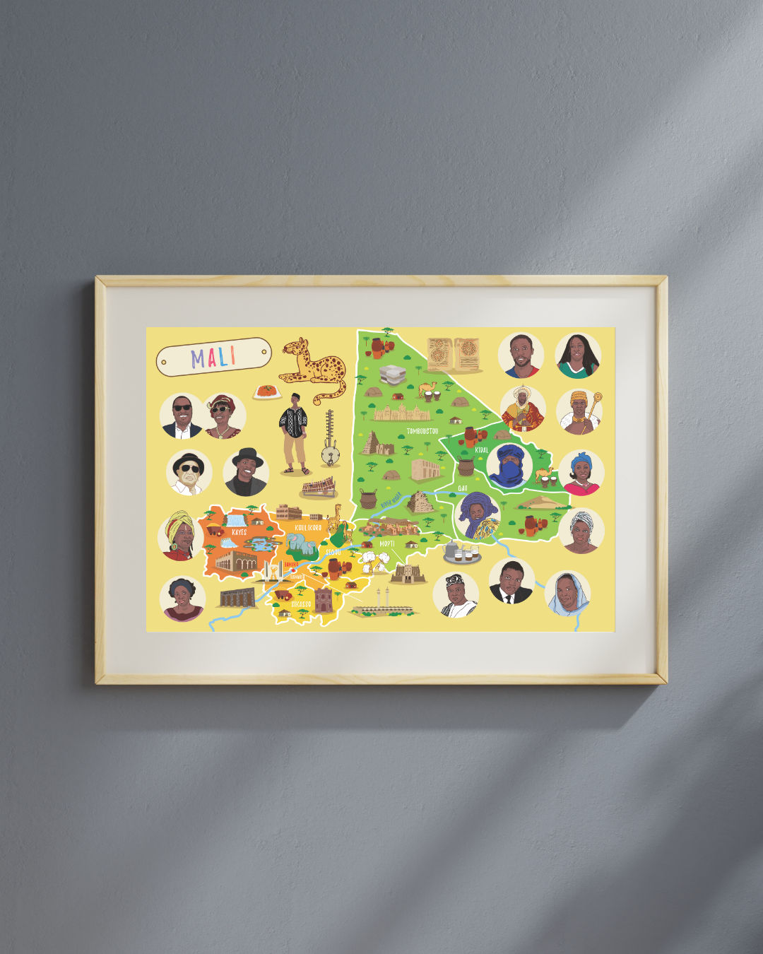 Surrounding the map are illustrated portraits of influential Malians from global music legends and cultural icons to powerful historical figures and national heroes. Their stories reflect the spirit and resilience of Mali and inspire the next generation to learn more about their heritage.