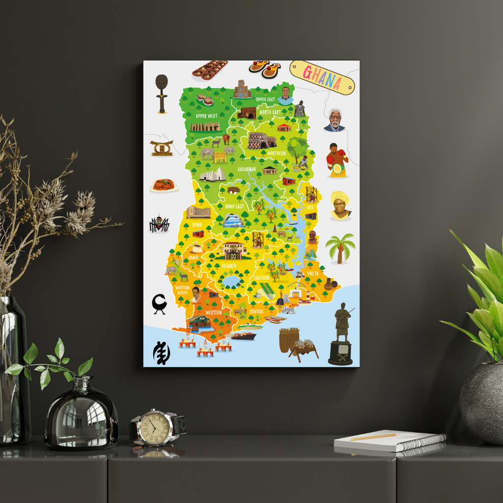 The Very Puzzled Ghana map poster is an A2 poster that accurately reflects the map of Ghana each region of Ghana is represented with a variety of landmarks, monuments and attractions it will provide endless fun and topics of discussion that can be used as fun way to learn for both children and adults.